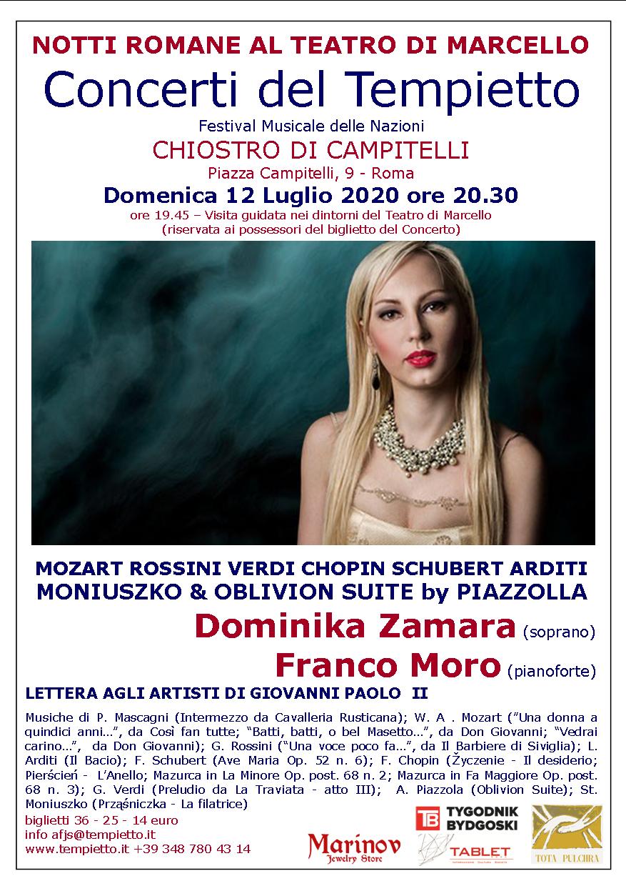 Si esibirà il soprano di fama internazionale Dominika Zamara (membro di primo ordine dell’Associazione Tota Pulchra) accompagnata al pianoforte dal Maestro Franco Moro con musiche di: Mozart, Rossini, Verdi, Chopin, Moniszko, Arditi ed altri, mentre l’attore Jannoni Sebastianini leggerà parte della Lettera agli Artisti scritta dal santo Padre.