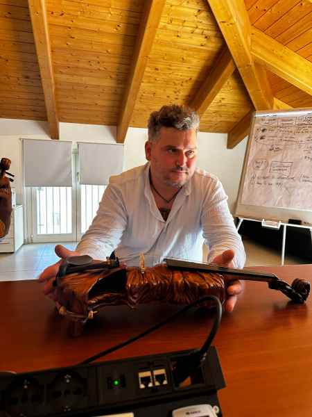 Questo percorso di dolore e rinascita sfocia nell’incontro con il tenore e violinista Francesco Malapena, figlio di liutaio, con cui Antonio crea il Violino dell’Anima: un’opera unica al mondo, in parte scultura, in parte strumento musicale, capace di suonare sia acusticamente che amplificato. Le finiture in ottone e madreperla sono realizzate dall’orafo Giovanni Pisacane. Il violino diventa così voce dell’Anima Velata: uno strumento che trasforma il silenzio del dolore in suono di speranza e bellezza.