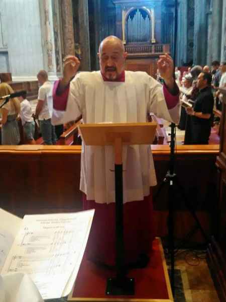 È Cantore Titolare e Decano già Maestro Vicario, con tre maestri succedutisi nel tempo, della Venerabile Cappella Musicale Giulia della S.S. Basilica Papale di S. Pietro in Vaticano dal gennaio 1980, entrato nel 1979 come uditore con il Maestro Armando Renzi con cui aveva sostenuto tempo prima l'esame di "solfeggio, setticlavio e materie complementari" per il corso di pianoforte al Conservatorio di Santa Cecilia in Roma.