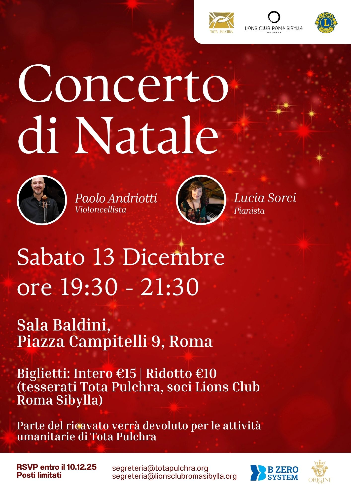 Sabato 13 dicembre 2025, a partire dalle ore 19:30, l’associazione Tota Pulchra, in collaborazione con il Lions Club Roma Sibylla, organizza il tradizionale Concerto di Natale presso la prestigiosa Sala Baldini di Roma.