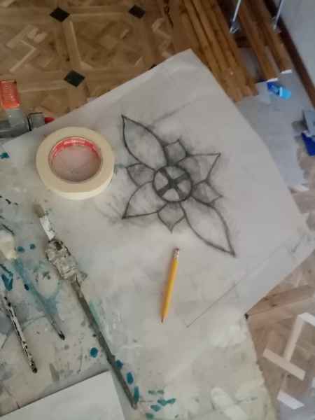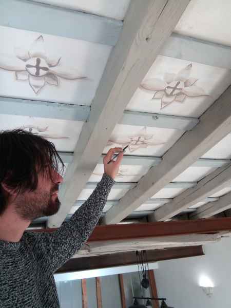 Si è successivamente provveduto alla stesura delle tinte e la riproduzione delle decorazioni in stile ottocentesco. Immediatamente con il primo sopralluogo con la committenza dei Signori Camilla Manetta e Stephane Krylyschin è nata una proficua collaborazione di stima e fiducia. Senza esitare nello stesso momento mi sono state date delle linee guida per la progettazione delle decorazioni. Il Sig. Stephane Krylyschin architetto e direttore lavori con esperienze lavorative in Francia (Parigi) ed in Italia (Roma), ha seguito i diversi lavori di restauro e ripristino con un continuo e rispettoso confronto analizzando l’epoca e le tecniche eseguite per il restauro. La soddisfazione di veder realizzato un lavoro in completa intesa con i committenti è stata un’emozione pura così come ridar vita ai luoghi. Sicuramente arriveranno nuove conquiste dettate dalla passione e dalla mia esperienza maturata in diversi anni di studio e di lavoro nei restauri effettuati in diverse regioni d’Italia e come artista e delegato dell’Associazione Tota Pulchra per il basso Lazio. La progettazione del disegno è iniziata con la creazione dei colori a base acrilica e diluiti in acqua creando velature con toni delicati e studiati per ciò che concerne il periodo storico dei soffitti e dei chiaro-scuri dando così l’effetto tridimensionale e plastico nel disegno, rosoni nei cassettoni e elementi ornamentali tipo foglie d’acanto con piccoli fiori sulle travi,mantenendo quel sapore antico e patina dell’epoca.