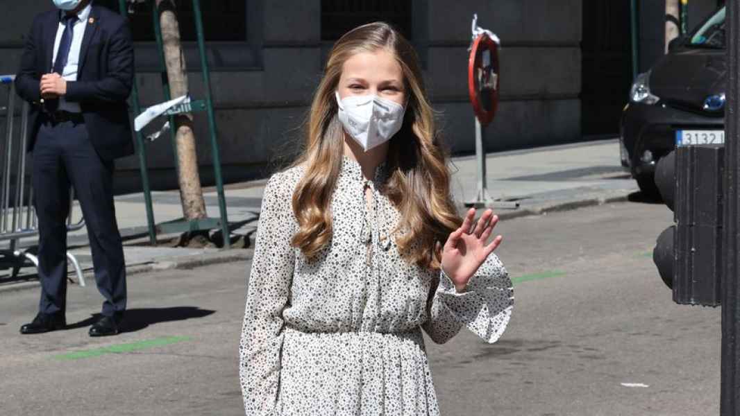 Al igual que suele hacer su madre, la reina doña Letizia, Leonor lució una prenda que ya llevó en uno de sus últimos actos. En concreto, se trata del vestido que lució en octubre de 2020 en Oviedo, con ocasión de la entrega de los premios Princesa de Asturias: un diseño de gasa de la firma española Poète, estampado con pequeñas florecillas, cuello mao abotonado en el escote, largo midi y manga larga terminada en un discreto volante. Como complementos, unos sencillos zapatos de pequeño tacón negro.
