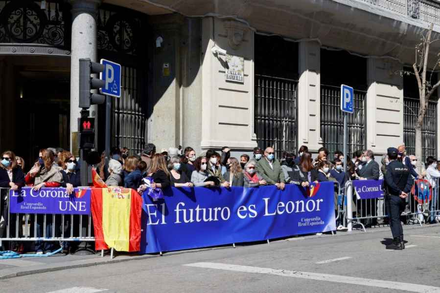 A las doce en punto de la mañana, la princesa llegó al Instituto Cervantes acompañada de Jaime Alfonsín, jefe de la Casa del Rey, así como de la única mujer ayudante de campo con la que cuenta Felipe VI. Fue aclamada por decenas de personas. Además, el grupo Concordia Real Española, que apoya activamente a la Monarquía en actos públicos, mostraba una llamativa pancarta con el lema “El futuro es Leonor”.