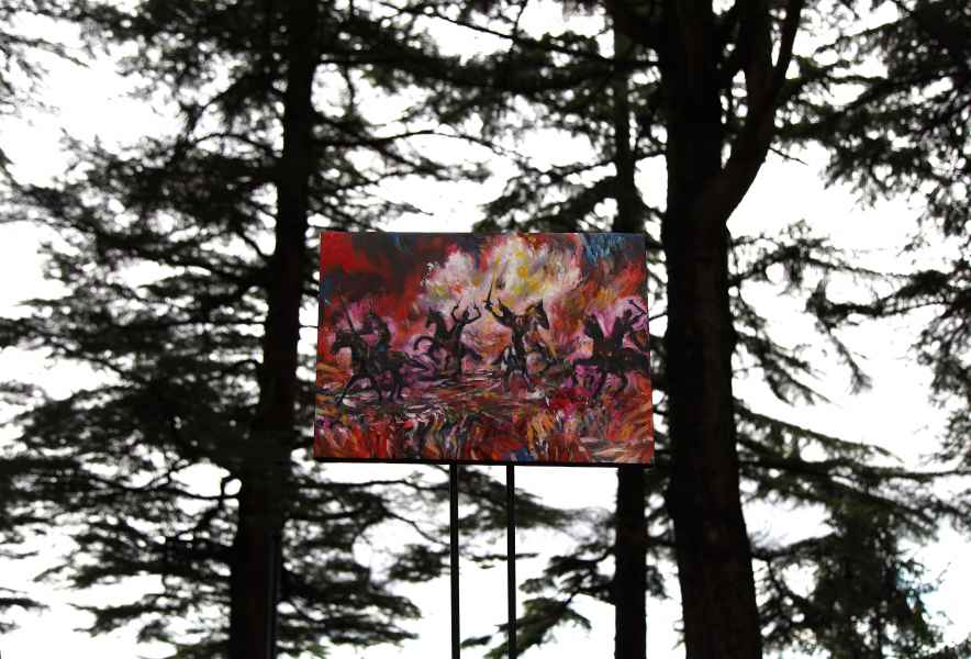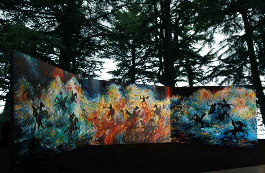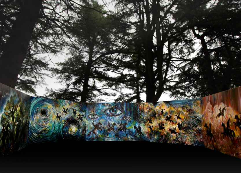 Per tale ragione le tele rettangolari raffigurano in una sequenza di eventi, le gesta cavalieri armati, che sulle nubi discendono verso lo spettatore nel loro incedere deciso. Cavalcano sopra un mondo caotico facendosi emblemi di valori come la giustizia, la rettitudine e il coraggio. Sfidano a loro volta gli elementi che li avvolgono, solcando acque e fiamme, i tubini e le terre sconquassate dal disordine. In uno scontro totale dove ogni certezza sembra traballare, l’artista invita a dimostrarsi saldi, sicuri di una elevazione del sé e per questo pronti a guardare oltre, alla maturazione ottenuta proprio a seguito della prova.