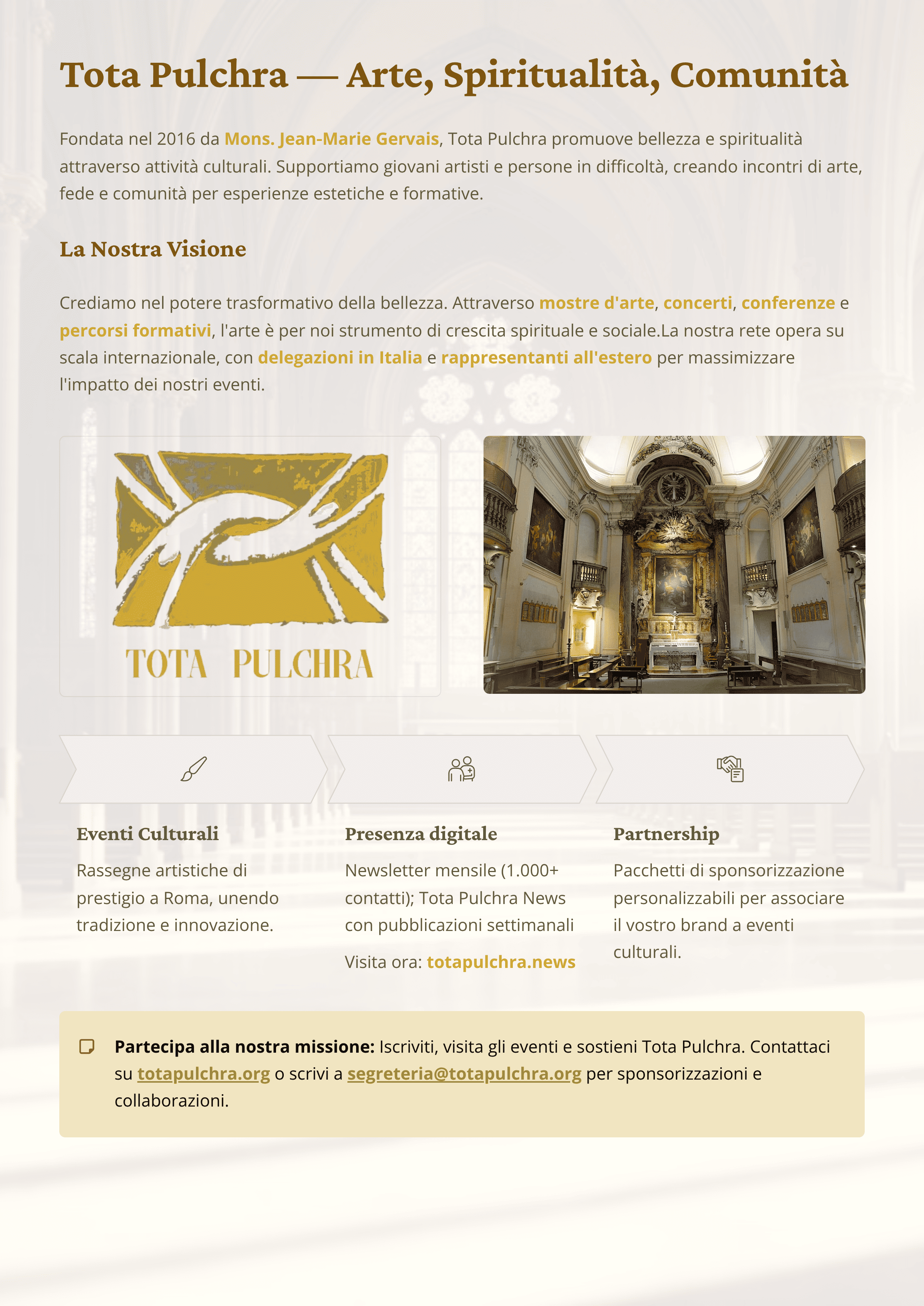 Fondata nel 2016 da Monsignor Jean‑Marie Gervais, l’Associazione Culturale Tota Pulchra promuove la bellezza e la spiritualità mediante produzione e promozione di eventi dedicati all’arte cristiana e al sostegno di artisti emergenti. La nostra sede principale è la Chiesa di Santa Maria Annunziata in Borgo, nel cuore di Roma, una location di grande valore simbolico e con elevato passaggio turistico.