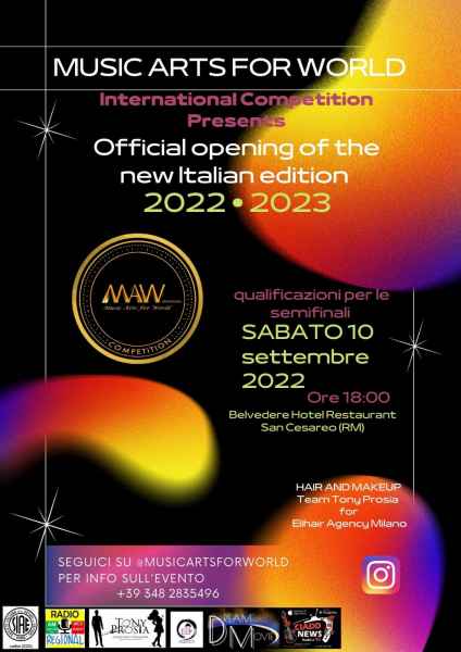 MAW Music Arts for World International Competition, è una competizione internazionale che spalanca le porte alla professione artistica, attraverso un tour nelle piazze e nei teatri di tutta Italia, una possibilità per gli Artisti in Italia e nel mondo, per crescere e fare economia.