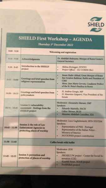Il progetto denominato Shield la cui traduzione fa già sottintendere la sua finalità, pone al centro dell’attenzione lo “Scudo” da porre a favore dei luoghi di culto. L’obiettivo di questo progetto sostenuto dal Fondo per la Sicurezza interna dell’Unione Europea e che vede quali promotori Enti pubblici e privati, riunisce sotto il suo ombrello le maggiori religioni. Proprio quest’ultimo aspetto è stato il punto di partenza nella giornata di workshop che ha avuto quale cornice la Grande Moschea di Roma.