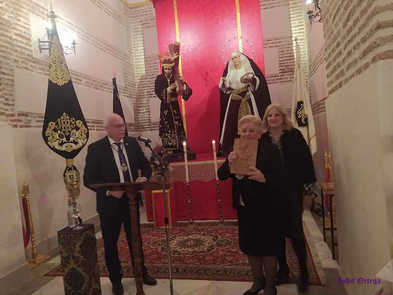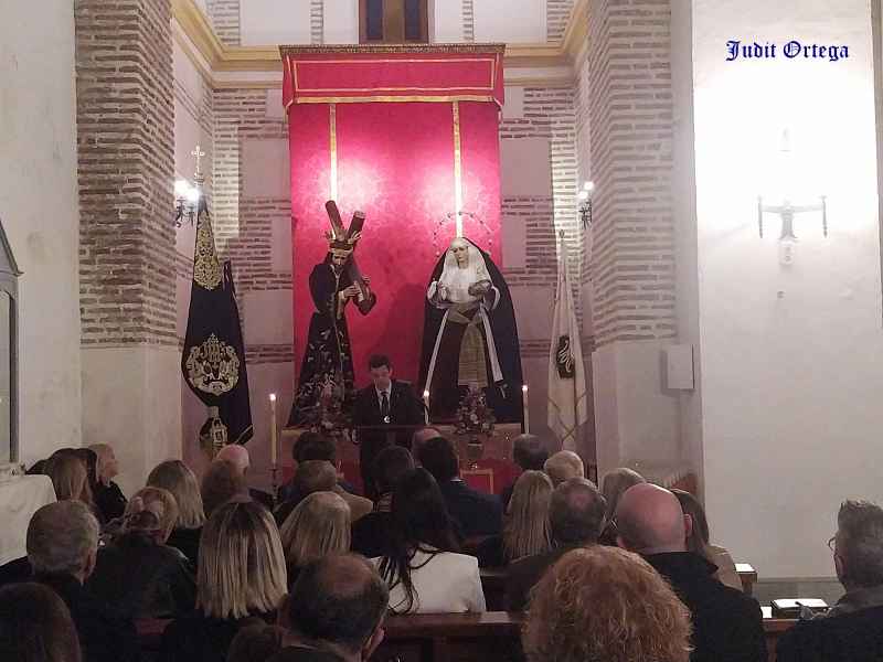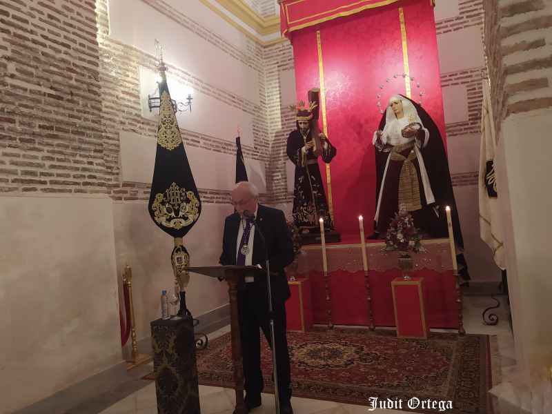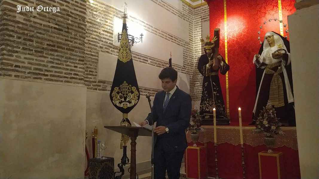 Tras un abrazo entre ambos, D. Jesús Horrillo tomó la palabra e inició su exaltación a los Sagrados Titulares. Comenzó reproduciendo una oración de dos siglos de antigüedad junto a las estampas del Nazareno y la Esperanza. Posteriormente prosiguió con el protocolario saludo a los asistentes: D. José Albaladejo consiliario de la cofradía, D. Manuel Terrón presidente de la Agrupación de Hermanades, Hermano Mayor y miembros de la Junta de Gobierno de la Cofradía del Nazareno, hermanos y hermanas cofrades en cristo.