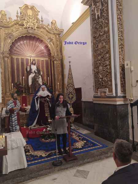 Después del protocolario saludo, tuvo palabras de agradecimiento a su presentador: “ Agradecida estoy, por darme la oportunidad de conocer a esa gran persona, que hoy a dado la cara por mi. Si, me refiero a ti Juan… cuando acepté pregonar a nuestra hermandad no tuve la menor duda que tenías que ser tú. Quiero que sepas que tus palabras me han emocionado, amigo Juan gracias por esta presentación, que no creo merecer…..”.