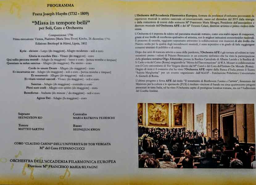 È stata eseguita la "Missa in tempore belli" di Franz Joseph Haydn per solisti, coro e orchestra, partitura molto complessa, di rara esecuzione e di grande bellezza, molto innovativa nel quadro della storia della musica per l'epoca in cui è stata composta, con dei momenti pregevoli in cui realmente brilla il genio musicale di Haydn.