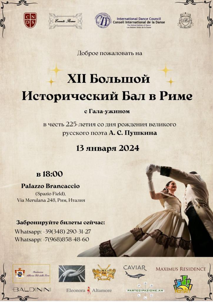 Sabato 13 gennaio 2024, alle ore 18.00, l’aristocratico Palazzo Brancaccio di Roma (Spazio Field, Via Merulana 248) ospiterà la XII Edizione del Gran Ballo Storico che, in un contesto di raffinatezza ed eleganza, fornirà l’occasione di immergersi in un’atmosfera imperiale e in un ambiente ricercato grazie alle danze storiche, agli spettacoli teatrali e alle arie. L’evento sarà dedicato al 225° anniveersario della nascità del grande poeta A.S. pushkin.