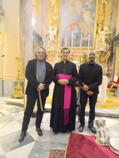 è con grande gioia che oggi vi accolgo in questa chiesa di Santa Maria Annunziata in Borgo, in occasione di questo importante concerto che vede protagonisti il flautista Andrea Ceccomori, insieme a Berg Campos e Aldo Azzaro. In un momento tanto significativo come il Giubileo, ci è dato di riflettere sul messaggio di pace, fraternità e lode alla creazione di San Francesco, attraverso la musica.