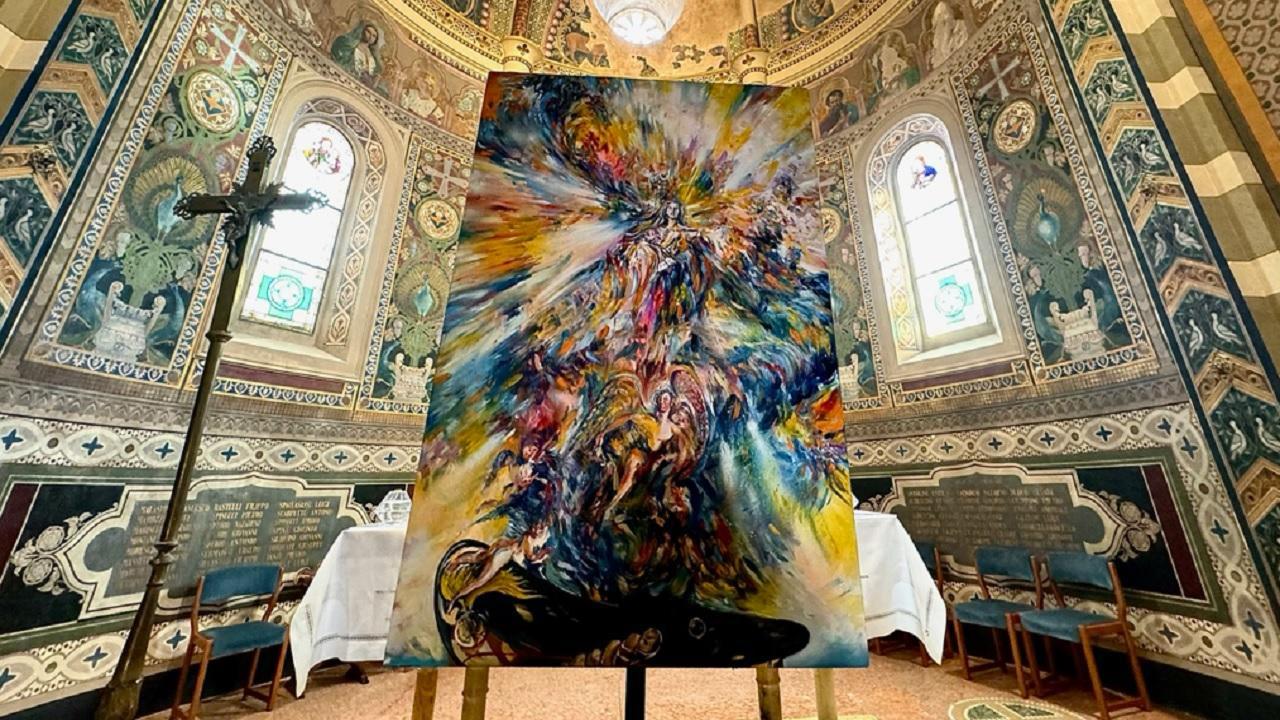 Vespasiani interpreta così la Virgo Fidelis come luce che orienta, come sguardo che accompagna, come presenza che richiama al servizio. L’uso dell’olio - tecnica cara all’artista - permette di modellare la luce con energia e dolcezza insieme, trasformando la tela in un luogo di incontro tra dimensione umana e dimensione spirituale.