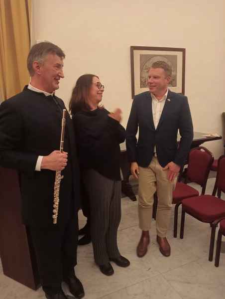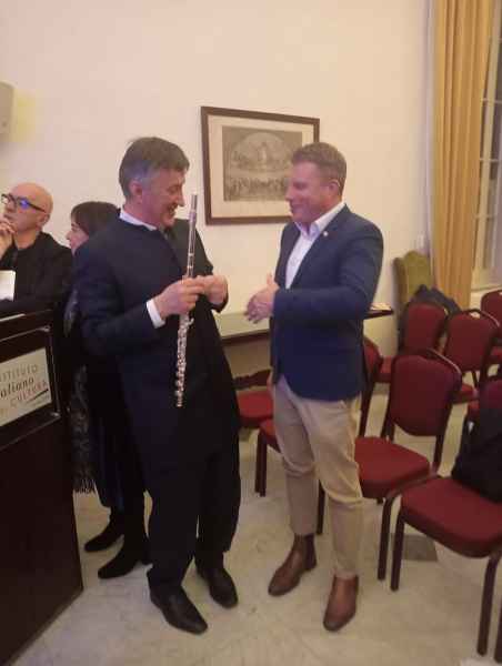 Mons. Jean-Marie Gervais rivolge vive e cordiali congratulazioni a Marco Baragli, flautista e membro dell’associazione Tota Pulchra, per il felice esito del concerto La Trinità del Suono, svoltosi il 14 gennaio 2026 presso l’Istituto Italiano di Cultura La Valletta.