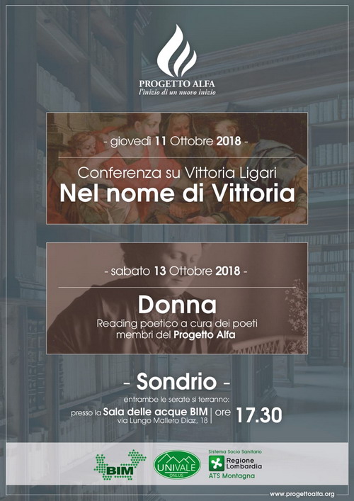 Giovedì 11 ottobre alle ore 17.30 presso la Sala delle Acque del BIM è previsto "Nel nome di Vittoria", conferenza sulla vita della pittrice Vittoria Ligari, la cui tenacia può essere d’esempio per le donne che devono lottare contro una prospettiva di vita avversa.