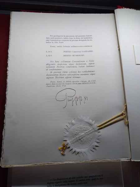 L’11 febbraio 1929, nella “Sala della Conciliazione” del Palazzo Lateranense, il Cardinale Segretario di Stato Pietro Gasparri e il Capo del Governo, il Primo Ministro Segretario di Stato Benito Mussolini, sottoscrissero i Patti Lateranensi con cui si stabilirono relazioni bilaterali tra il Regno d’Italia e la Santa Sede, da cui nacque lo Stato della Città del Vaticano.