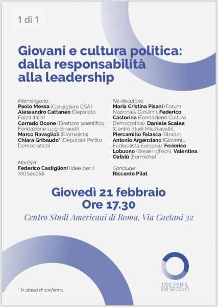 Giovedì 21.02.2019, presso il salone principale del Centro Studi Americani di via Michelangelo Caetani 32, si è svolto un importante convegno dal titolo: “Giovani e cultura politica: dalla responsabilità alla leadership”. L’adunata è stata organizzata da Riccardo Pilat, giovane di belle speranze nonché autore del saggio: “L’armonia del potere. Verso una nuova agorà dell’Umanesimo”, libro che sta riscuotendo notevole successo per la semplicità contenutistica unita ad una chiarezza espositiva che fanno del Pilat uno studioso emergente di geopolitica. A moderare l’evento è stato il dott. Federico Castiglioni, dottorando in “Scienze Politiche” presso l’Università di Roma 3 e ideatore di “Intellegoblog”.