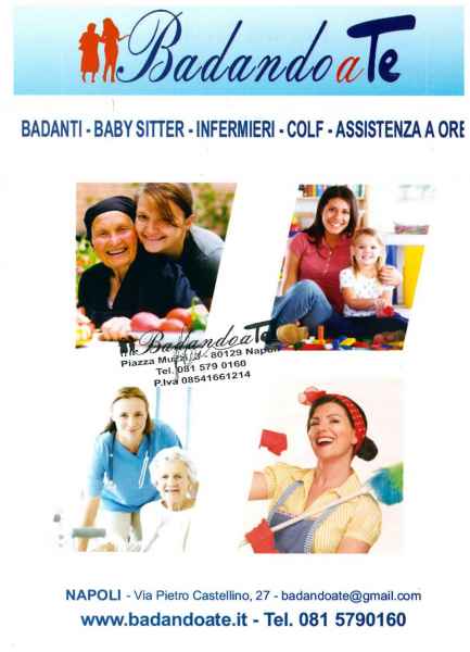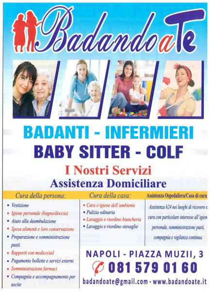 “Badando a Te”: è un’associazione privata che offre assistenza a persone della terza età che hanno una ridotta autosufficienza. I servizi vengono svolti, come leggiamo dal sito, da un gruppo di professioniste/i altamente specializzati e qualificati in ogni tipo di assistenza che possa essere necessaria alla fascia della terza età. Le prestazioni prevedono assistenza domiciliare con cura della persona: vestizione; igiene personale; aiuto alla deambulazione; spesa alimenti e loro conservazione; preparazione e somministrazione pasti; rapporti con medico/asl; pagamento bollette e servizi esterni; somministrazione farmaci e compagnia e accompagnamento per uscite. Inoltre, i servizi prevedono anche la cura della casa: cura e igiene dell’ambiente; pulizia ordinaria; lavaggio e riordino biancheria e stovaglie.