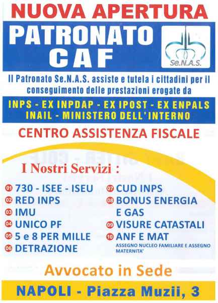 Patronato CAF (Centro Assistenza Fiscale). Il Patronato Se.N.A.S assiste e tutela i cittadini per il conseguimento delle prestazioni erogate da INPS, EX INPDAP, EX IPOST, EX ENPALS, INAIL, Ministero dell’Interno). Ecco, in dettaglio, i servizi offerti: 730-ISEE-ISEU; RED INPS; IMU; UNICO PF; 5 e 8 per Mille; Detrazione; CUD INPS; Bonus Energia e gas; Visure Catastali e ANF e MAT (assegno nucleo familiare e assegno maternità.
