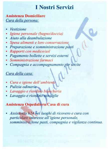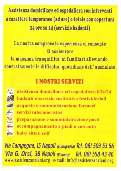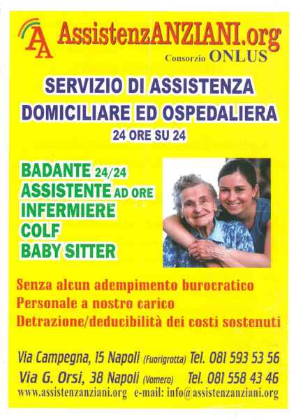 “Assistenza Anziani”: servizio di assistenza domiciliare ed ospedaliera (h24) di comprovata esperienza. L’associazione mette a disposizione badanti e servizio sostitutivo nei giorni festivi e feriali; assistenti ad ore (accompagnamento a piedi o in auto, acquisto e somministrazione di farmaci e preparazione di pasti); servizi infermieristici; colf e baby sitter. Il tutto senza alcun tipo di adempimento burocratico; personale interamente a carico della onlus, e infine, detrazione/deducibilità dei cosi sostenuti.