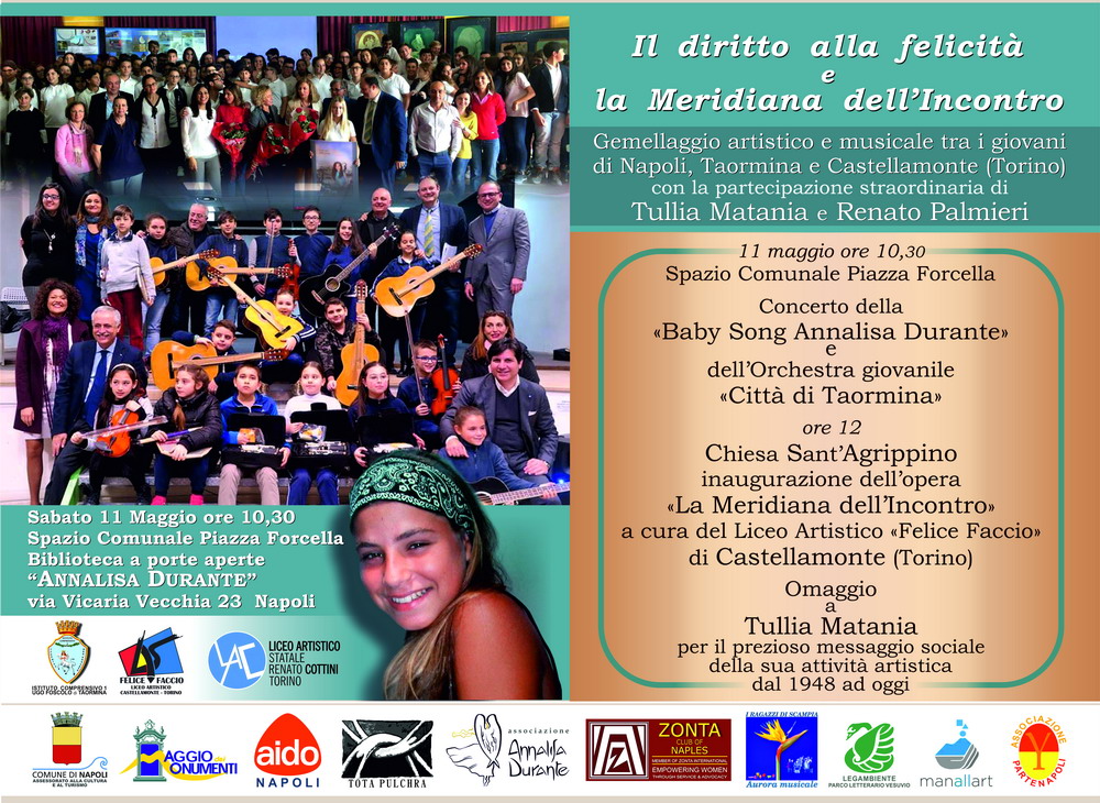 A conferma della forza simbolica della “Meridiana dell’incontro”, propiziatrice di scambi culturali tra giovani artisti, nasce in quella stessa sede l’auspicio di un gemellaggio musicale tra l’Orchestra giovanile di Taormina e la “Baby Song Annalisa Durante” di Forcella, che si realizza oggi insieme al gemellaggio artistico con i licei piemontesi, attraverso un concerto musicale di circa 100 giovani musicisti siciliani e napoletani, a cui seguirà l’inaugurazione dell’opera scultorea proprio sul tratto di strada della “y” pitagorica di Neapolis.