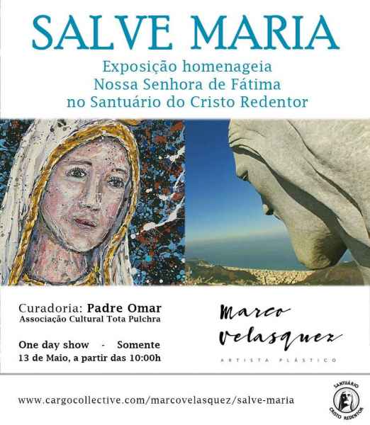 Nessa segunda-feira, 13 de maio, a partir das 10h, o Santuário Cristo Redentor receberá a exposição "Salve Maria”, do artista plástico Marco Velasquez. Realizada em apenas um dia, é uma homenagem a Nossa Senhora na data em que a Virgem Maria apareceu aos três pastorinhos sobre uma azinheira, em Fátima (Portugal).
