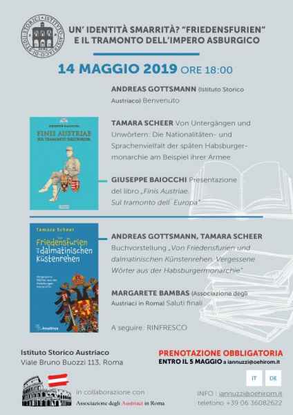 Martedì 14-05-2019, presso l'Istituto Storico Austriaco (Viale Bruno Buozzi n.111 - 00197 Roma, ore 18:00/20:00), in collaborazione con l'associazione "Austriaci in Roma", è avvenuta la presentazione dei saggi della dott.ssa Tamara Scheer e dell'arch. Giuseppe Baiocchi. L'evento, presentato dal direttore dell'Istituto dott. Andreas Gottsmann, ha visto dopo un'introduzione sull'Impero dell'Austria-Ungheria della dott.ssa Scheer, una prima analisi sugli antichi idiomi in uso durante la Monarchia Duale, come vecchi modi di dire e singole parole, oggi scomparse in Austria; in seconda battuta l'autore del saggio di "Finis Austriae. Sul tramonto dell'Europa" l'arch. Baiocchi ha raccontato al pubblico la tematica architettonica intrapresa nell'opera, soffermandosi in particolar modo "dallo storicismo di Sitte, alla rivoluzione di Adolf Loos". Un viaggio speciale che ha trasportato il pubblico, nutritissimo, all'interno di un'epoca passata ricca di grandi emozioni. Il "mondo di ieri" ha visto protagonisti Sitte, Wagner, Olbrich, Hofmann e Loos in un susseguirsi di architetture, alcune note altre meno. Il quesito si è incentrato propriamente sulle motivazioni che hanno spinto questi architetti ad evolvere il loro modo di progettare fino al razionalismo dalla forma pura e dall'angolo retto. Oggi l'uomo europeo non deve dimenticare da dove proviene, di quali radici deve nutrirsi e l'architettura è la disciplina più importante, afferma l'autore, perché è sotto gli occhi di tutti. Splendido il dibattito finale, condotto da Gottsmann, con il pubblico.