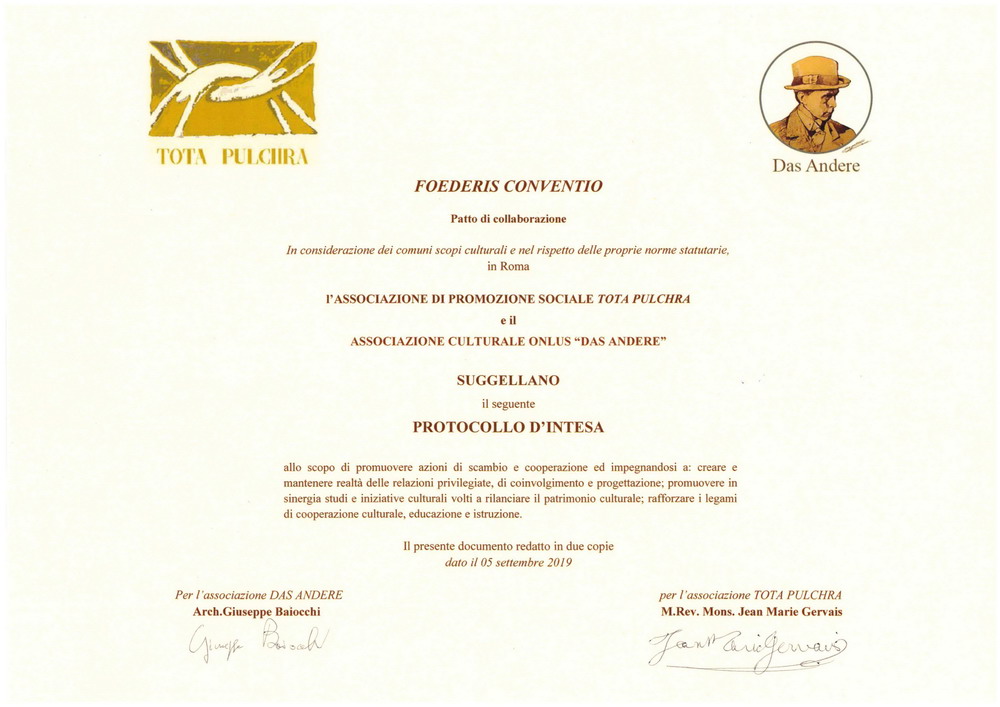 Mons. Jean Marie Gervais, Presidente dell'Associazione "Tota Pulchra", e l'Architetto Giuseppe Baiocchi, Presidente dell'Associazione "Das Andere", sottoscrivono un protocollo d'intesa allo scopo di promuovere in sinergia studi e iniziative culturali volti a rilanciare il patrimonio culturale, rafforzare i legami di cooperazione culturale, educazione ed istruzione.