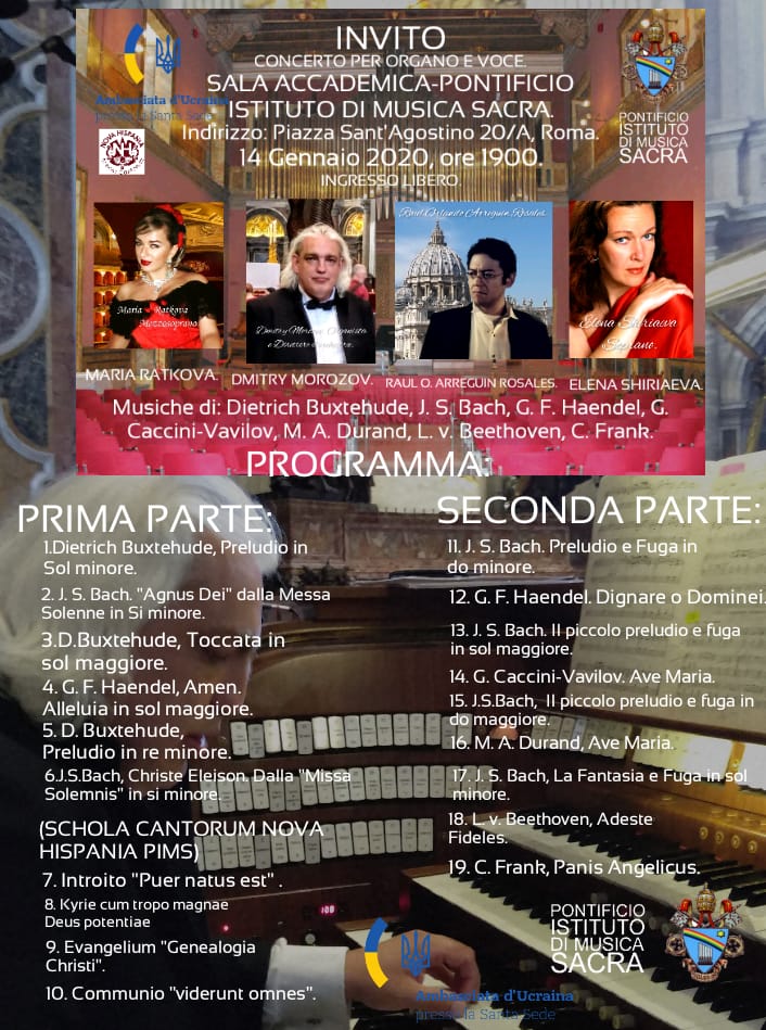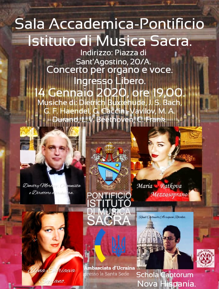 Il giorno 14 gennaio, organizzato dal socio onorario della Tota Pulchra Conte Prof. Giuseppe Tedeschi, Addetto di Anticamera di Sua Santità, si terrà alla Sala Accademica del Pontificio Istituto di Musica Sacra (PIMS) un concerto per organo e voce del Maestro Ucraino Dmitry Morozov, concertista d'organo internazionale, e direttore d'orchestra principale del Teatro Nazionale Accademico di Stato dell'Opera e del balletto di Kharkiv (Ucraina).