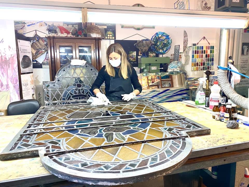 Il restauro è consistito nella pulizia iniziale, nello studio delle tecniche da utilizzare e nella ricerca dei vetri più idonei che l’artigiana ha raccolto negli anni.