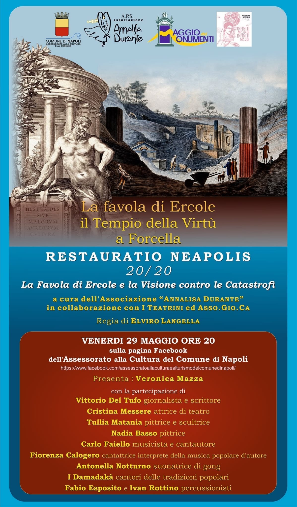 “RESTAURATIO NEAPOLIS 20/20. La Favola di Ercole e la Visione contro le Catastrofi”. E’ questo il titolo della performance artistica che l’Associazione Annalisa Durante presenterà venerdi 29 maggio alle ore 20 sulla pagina facebook dell’Assessorato alla Cultura e al Turismo del Comune di Napoli, nell’ambito del Maggio dei Monumenti. Un viaggio culturale e sociale che l’associazione di Forcella, intitolata alla memoria della vittima innocente di camorra Annalisa Durante, sta portando avanti da anni per la rigenerazione del quartiere, con il progetto “La Meridiana dell’Incontro”: gemellaggi artistici con varie realtà italiane, tra le quali l’APS Tota Pulchra per la Promozione delle Arti, sotto la guida del prof. Elviro Langella e di Giuseppe Perna.