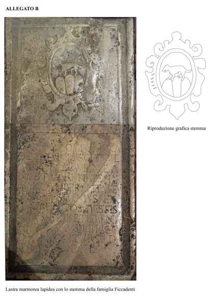 Ancora la notizia è riportata dallo studioso Bernardo Carfagna il quale durante l’analisi delle “casate e personaggi ascolani negli stemmi della città” parla della famiglia Ficcadenti. Viene riportata la lastra tombale di Bartolomeo Ficcadenti nella Chiesa di Sant’Agostino. L’epigrafe è riportata nell’opera “Monumenti” di G.Frascarelli. Oggi tale lastra in travertino è situata ai piedi dell’abside della navata centrale[1]