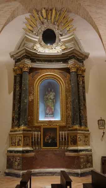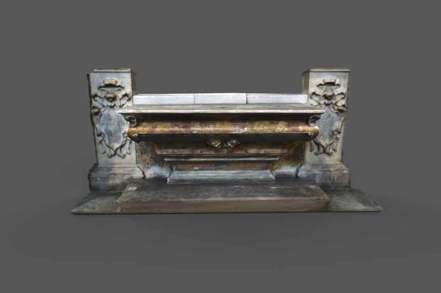 L’altare minore di San Giuseppe oggetto del restauro e del ripristino del sarcofago, possiede un’altezza di 11,77 metri e una larghezza di 5,28 metri. Esso si presenta di materiale misto: porzioni di materiale lapideo e muratura intonacata. Il basamento delle colonne in foglia oro, così come i capitelli possiedono un trattamento decorativo in finto marmo di cromia variabile. Il coronamento che sovrasta l’architrave convesso si presenta in stile barocco controriformistico in stucco. Il manufatto attualmente versa in condizioni dignitose, con un degrado diffuso, riscontrabile dalle estese lacune del film pittorico per causa dell’umidità di risalita e di condensa. Per avere il riscontro tecnico dettagliato, si rimanda alla futura analisi del restauratore.