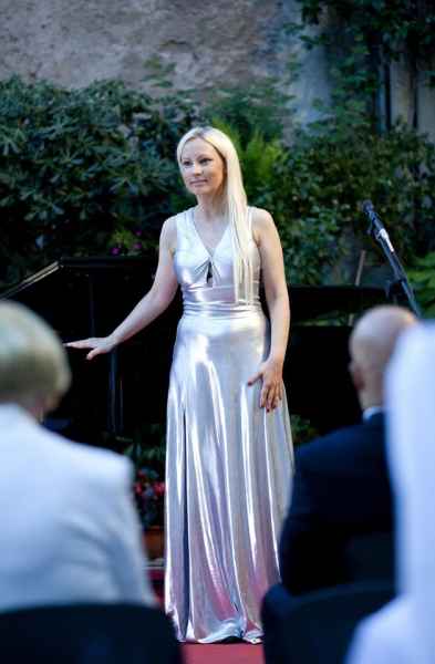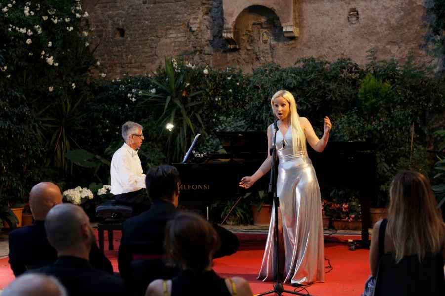 È stata una serata di grande arte quella di domenica, presentata da Lucia Bove. Iniziata con la lettura di alcune poesie di Eugenio Montale tra cui “Meriggiare pallido e assorto” decantate da Jannoni Sebastianini che ha scaldato gli animi, poi si sono avvicendate le poetesse Tiziana Marini, Daniela Amante, Gabriella Giuliani, Anna Siani e Anita Napolitano con un proprio repertorio. Finita questa kermesse poetica ci siamo addentrati nel vivo della serata con il concerto, iniziato con un pezzo per solo pianoforte “C’era una volta il West” in omaggio al Maestro Enio Morricone scomparso da poco. Fa il suo ingresso Dominika Zamara, stella indiscussa della serata, che ha dato una grande prova delle sue doti vocali, deliziando il pubblico presente, inizia con le arie Una “Donna a quindi anni” dall’opera Così fan tutte di Mozart, poi sempre di quest’ultimo compositore “Batti batti o bel Masetto” dal Don Giovanni. Lasciato nuovamente lo spazio al Maestro Moro con il Preludio dall’opera La Traviata. Oramai all’imbrunire la Zamara scalda ancor più gli animi con “Il Bacio” di Arditi. Qui inizia un momento di sacralità, l’attore Sebastianini decanta parte della “Lettera agli Artisti” di Giovanni Paolo II con un delicato sottofondo di pianoforte. Si susseguono l’aria “Vedrai Carino” dal Don Giovanni di Mozart, due Mazurche di Chopin Op 68 n2 e n3. Ora un altro momento di sacralità con l’Ave Maria di Schubert. La Zamara fa un omaggio alla sua terra, la Polonia con tre lieder di Chopin: “Życzenie”, “Pierścień”, “Smutna rzeka”, poi per piano solo “Obliviom Suite” di Piazzola rivisitata dallo stesso Moro. Ci avviamo verso la fine del concerto che culmina con l’aria “Quando m’en vò” dall’opera La Boheme di Puccini, sotto una pioggia di applausi gli artisti regalano un bis, “Tace il labbro” dall’operetta La Vedova allegra di Lehar. Non rimane che il tempo per i complimenti davvero meritati e le foto di rito, in conclusione possiamo dire: abbiamo potuto assistere ad un concerto di alto livello in cui la voce della Zamara ha lasciato un segno indelebile in una notte romana e nei cuori dei presenti.