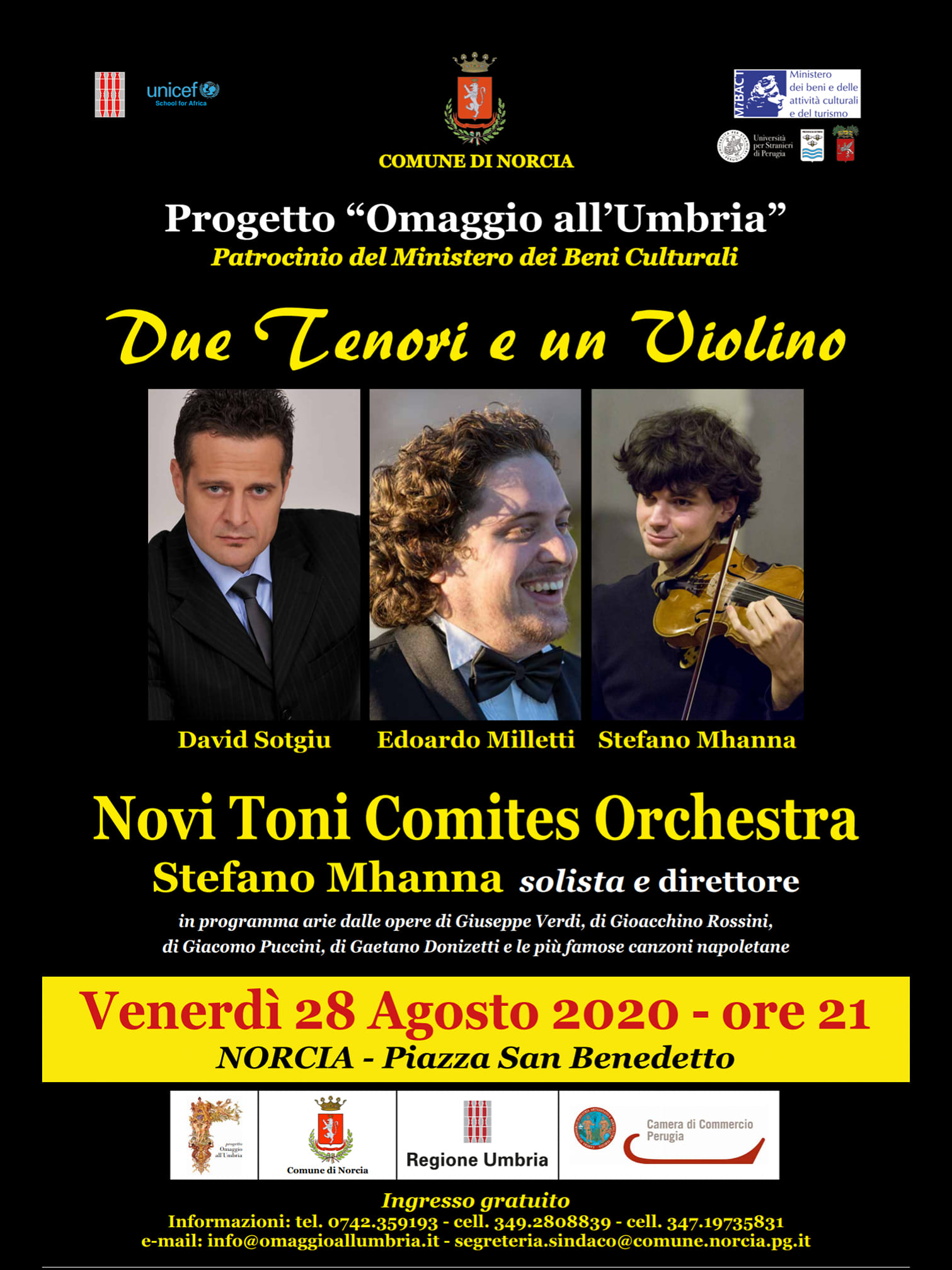 Venerdì 28 Agosto l’appuntamento è a Norcia, sempre alle ore 21.00, con il talento del giovane Stefano Mhanna che si esibirà alla guida della sua Novi Toni Comites Orchestra in piazza San Benedetto con ”Due Tenori e un violino”. I due tenori sono David Sotgiu ed Edoardo Milletti, il violino sempre quello di Stefano Mhanna.