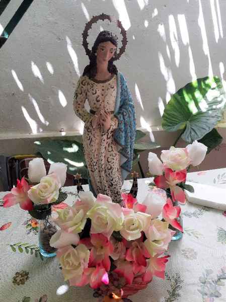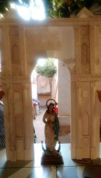 Siempre que llegamos a la casa, comentábamos, la Virgen se ve muy poco acompañada, ahí sobre una mesa, con trapillos, y las flores que dejan sus fieles sobre las rejas, fue entonces cuando Francisco Javier se encargó de hacerle una especie de Altar para que estuviese como se merece, más resplandeciente; muy parecido a una de sus Iglesias más emblemáticas.