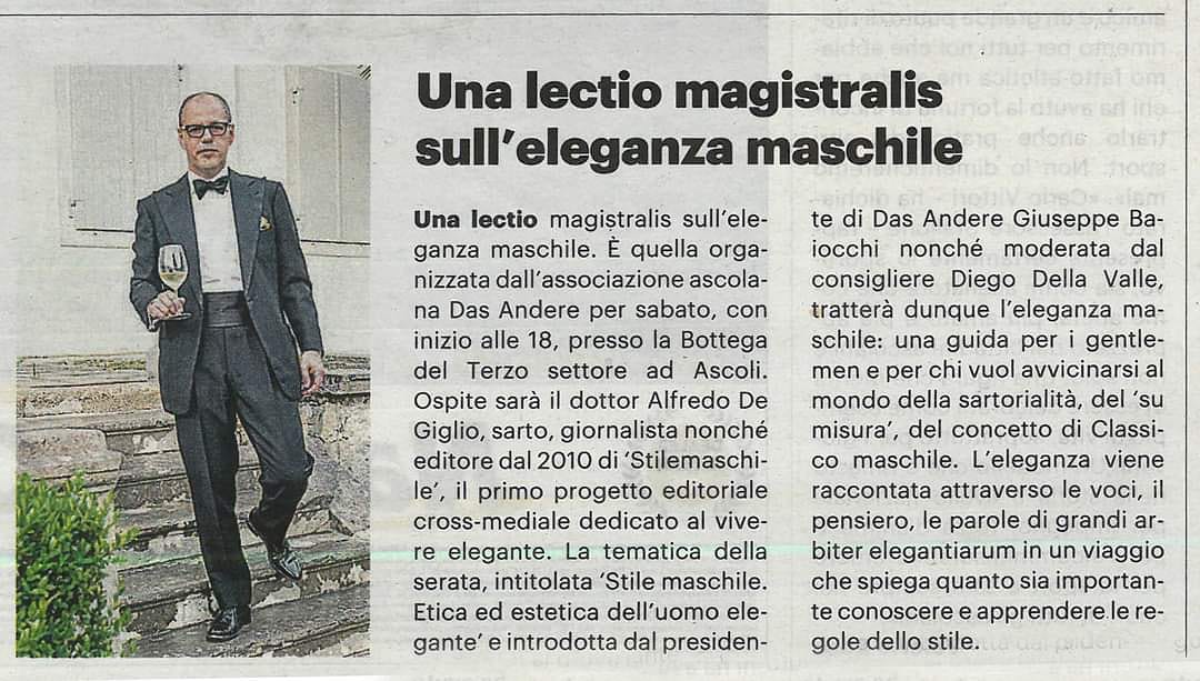 Sabato 17 ottobre 2020, presso la Bottega del Terzo Settore è andato in scena il 57° incontro dell'associazione culturale onlus Das Andere. L'evento ha visto la presenza del Dott. Alfredo De Giglio- sarto, giornalista e editore dal 2010 di Stilemaschile, il primo progetto editoriale cross-mediale dedicato al vivere elegante. La tematica introdotta dall’architetto e presidente Giuseppe Baiocchi e moderata dal consigliere Diego Della Valle, ha trattato l’eleganza maschile: una guida per i gentlemen e per chi vuol avvicinarsi al mondo della sartorialità, del “su misura”, del concetto di Classico maschile. L’eleganza è stata raccontata attraverso le voci, il pensiero, le parole di grandi arbiter elegantiarum in un viaggio che spiega quanto sia importante conoscere e apprendere le regole dello stile.