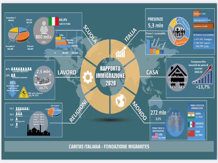 Il rapporto descrive il quadro internazionale basandosi sul Global Trend Report (UNHCR) e la mobilità in Europa evidenziando il dato delle nascite sul territorio e poi fa una panoramica, fotografando la situazione in Italia.