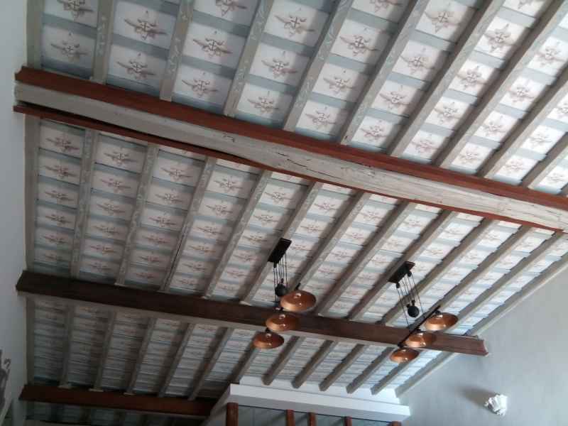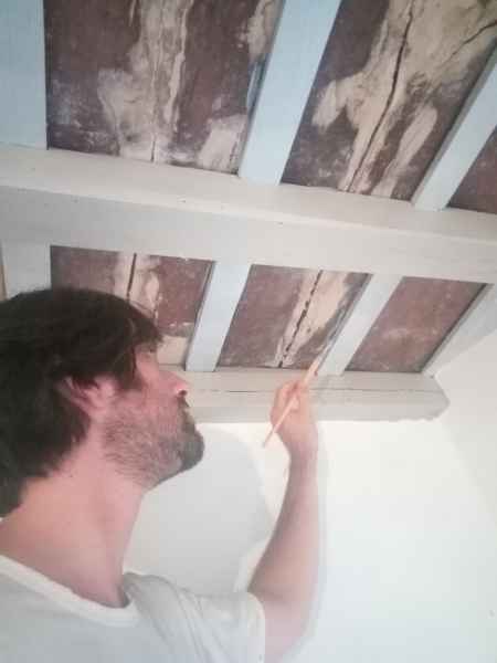 Si è successivamente provveduto alla stesura delle tinte e la riproduzione delle decorazioni in stile ottocentesco. Immediatamente con il primo sopralluogo con la committenza dei Signori Camilla Manetta e Stephane Krylyschin è nata una proficua collaborazione di stima e fiducia. Senza esitare nello stesso momento mi sono state date delle linee guida per la progettazione delle decorazioni. Il Sig. Stephane Krylyschin architetto e direttore lavori con esperienze lavorative in Francia (Parigi) ed in Italia (Roma), ha seguito i diversi lavori di restauro e ripristino con un continuo e rispettoso confronto analizzando l’epoca e le tecniche eseguite per il restauro. La soddisfazione di veder realizzato un lavoro in completa intesa con i committenti è stata un’emozione pura così come ridar vita ai luoghi. Sicuramente arriveranno nuove conquiste dettate dalla passione e dalla mia esperienza maturata in diversi anni di studio e di lavoro nei restauri effettuati in diverse regioni d’Italia e come artista e delegato dell’Associazione Tota Pulchra per il basso Lazio. La progettazione del disegno è iniziata con la creazione dei colori a base acrilica e diluiti in acqua creando velature con toni delicati e studiati per ciò che concerne il periodo storico dei soffitti e dei chiaro-scuri dando così l’effetto tridimensionale e plastico nel disegno, rosoni nei cassettoni e elementi ornamentali tipo foglie d’acanto con piccoli fiori sulle travi,mantenendo quel sapore antico e patina dell’epoca.