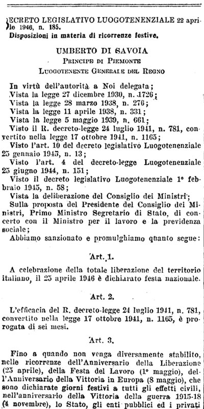 Il 22 Aprile 1946 il Principe Umberto di Savoia, Principe di Piemonte, Luogotenente del Regno d’Italia, istituiva il 25 Aprile Festa Nazionale a celebrazione della totale liberazione del territorio italiano.