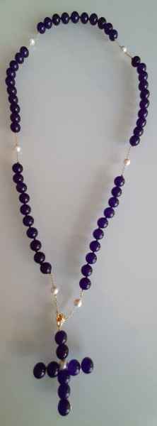 Gisella Scibona entra a far parte di Tota Pulchra, Associazione Artistica e Culturale, di cui il Presidente è il Monsignor Jean-Marie Gervais,grazie alla presentazione della cara amica Anna Poletti Zanella. Qui incontra anche l’artista Mario Tarroni con cui ha la possibilità di interfacciarsi con il grande Maestro e Stilista Roberto Capucci. La devozione molto forte che Gisella ha verso la figura della Madonna tramandata dalla sua famiglia e dalle sue origini, nasce in un paese di nome Santa Maria, scaturito dal ritrovamento di un quadro raffigurante la Madonna del bosco. La sua devozione alla Vergine va di pari passo con l’Arte dello stilista italiano, che in questo momento, grazie al sostegno di Mario Tarroni, ha realizzato una mostra di abiti dedicati all’iconografia della Madonna. Anche Gisella ha trasformato la sua devozione in arte sacra, il vero obiettivo di Gisella. Ha realizzato la prima coffartistica raffigurante la Madonna del Bosco, un omaggio alla patrona del suo paese di origine, alla quale è molto legata. Ma l’artista siciliana esprime questa sua devozione non solo tramite coffe e abiti, ma anche tramite gioielli. Progetta e realizza, così la Corona del Rosario” gioiello” realizzata con pietre semi preziose intervallate da perle. Gisella intende riprendere l’antica tradizione delle nobili donne siciliane esse erano realizzate con la prestigiosa ambra del Simeto, il corallo, la madreperla ecc. Gisella tra le numerose corone “gioiello” realizzate con varie pietre dure semi preziose colorate, ne realizza di colore viola, con ametiste e perle che dona proprio allo stilista Capucci, il quale rimane profondamente colpito sia per significato, dell’alto valore spirituale, sia della bellezza stessa del rosario, tanto da inviare a Gisella una personale lettera di sentito ringraziamento “…La ringrazio di cuore per il simbolico e magnifico regalo, il rosario è bellissimo, sarà per me un dono prezioso…”