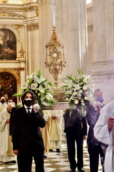 La procesión claustral comenzó al final la celebración eucarística con la custodia construida por el platero Téllez en 1501, partiendo de un espejo de oro que perteneció a la Reina Isabel de Castilla. Fue portada por tandas de 4 costaleros en las andas de plata del siglo SVIII. Transcurrió por el pasillo central hasta la mitad, giró hacia la capilla penitencial, llegando hasta la puerta principal para regresar al Altar Mayor de la misma.