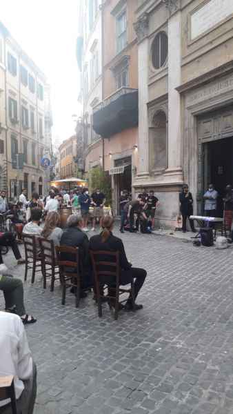 Roberto Milana, violinista diplomato di alto livello, ha suonato brani di musica classica, nell'attento silenzio degli astanti. é seguita l'esibizione del gruppo "Grm Management", etichetta musicale emergente attiva appunto sul fronte della solidarietà. In apertura, il cantautore pistoiese Luca Floridi ha presentato una selezione di suoi brani: è seguita l'esibizione, in un duo acustico con atmosfere r&b, della bella Domino; mentre il cantautore romano Pgreco, dell' Indie pop Roma, ha dominato la seconda parte del concerto, soffermandosi poi sul valore socializzante ed anche terapeutico della musica, alla luce dell'esperienza collettiva dei romani in quasi un anno e mezzo di lotta contro il Covid-19.