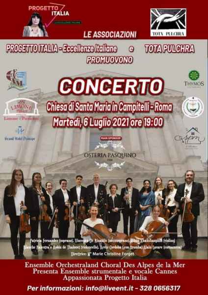 Concerto nel quadro dell'attività culturale di Tota Pulchra organizzato e curato nella direzione artistica dal Conte Prof. Giuseppe Tedeschi, socio onorario, e con la perfetta organizzazione e supporto della tournée dell'orchestra francese garantiti dal vicepresidente Danilo Maira. Bellissima serata alla presenza di un prestigioso parterre con diplomatici e personalità del mondo della cultura. Presente tra gli altri, oltre al presidente di Tota Pulchra, Mons. Jean Marie Gervais Prefetto dei Coadiutori del Capitolo di San Pietro in Vaticano, e il vicepresidente Danilo Maira, il caro amico Reverendo Archimandrita Symeon Katsinas , in rappresentanza della Sacra Arcidiocesi Ortodossa d'Italia ed Eparchia dell'Europa Meridionale, la Socia Onoraria di Tota Pulchra il Mezzosoprano Maria Ratkova, il Socio onorario di Tota Pulchra Dr. Maurizio Napoli della Banca Finnat con la consorte Tina Klimova - Napoli. Ha diretto il M.° Marie Christine Forget.