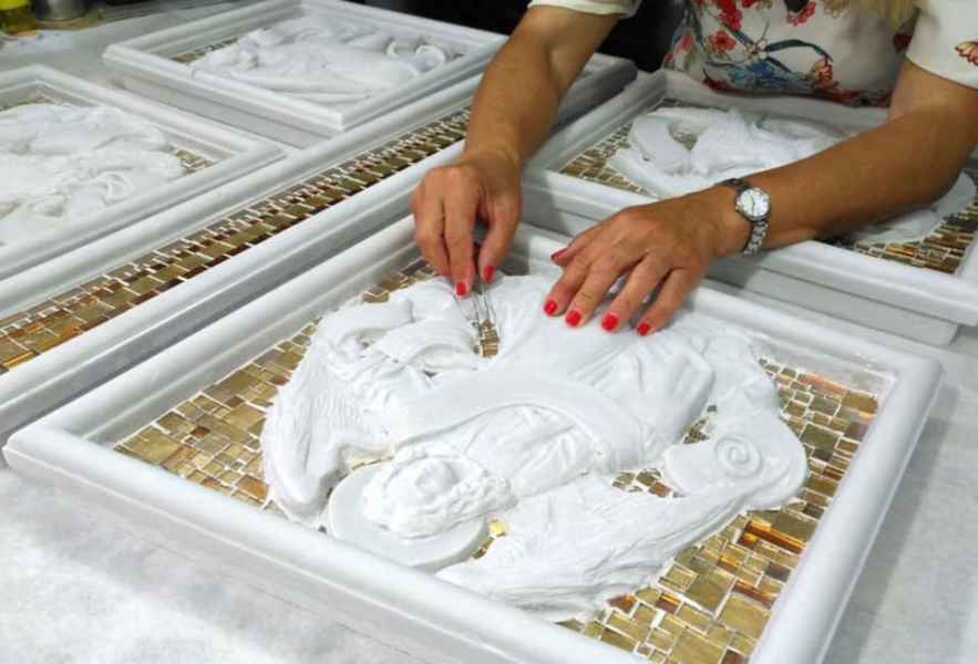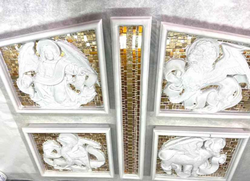 E’ stato un impegno minuzioso e di grande precisione: le tessere sono state create personalmente in varie tonalità oro e differenti misure e poi tagliate e sagomate una per una, in modo da creare l’incastro perfetto tra supporto e rivestimento.