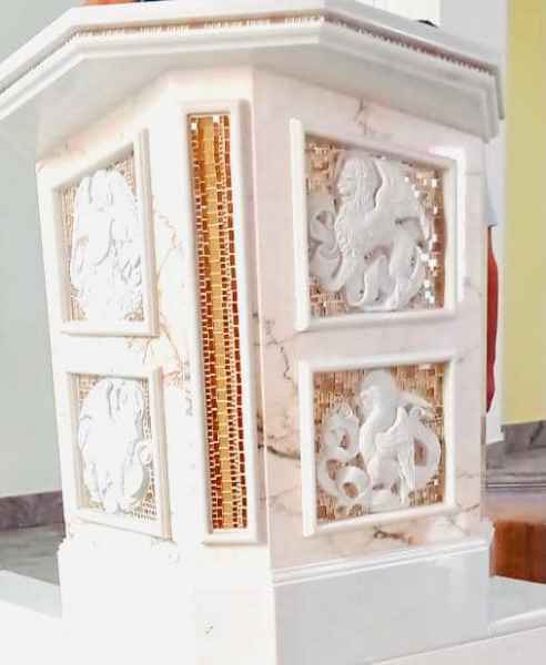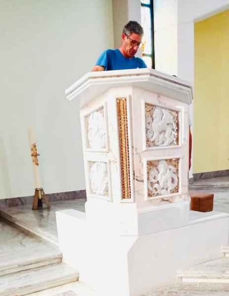 L’ambone è realizzato in marmo di Carrara acqua bianca dall’azienda delle Sorelle Così di Surano e Maria Concetta ha lavorato nel rivestimento vetroso con la tecnica del mosaico.