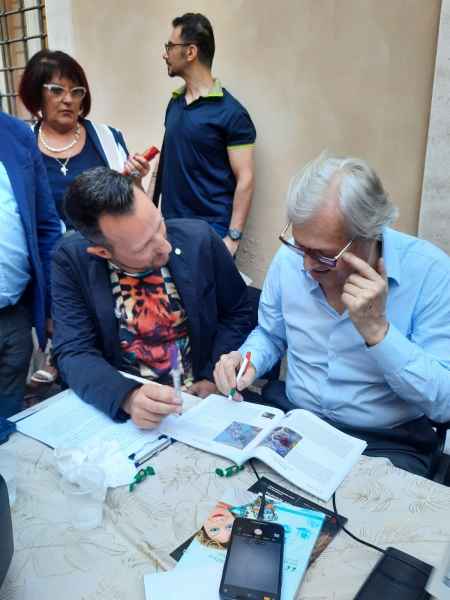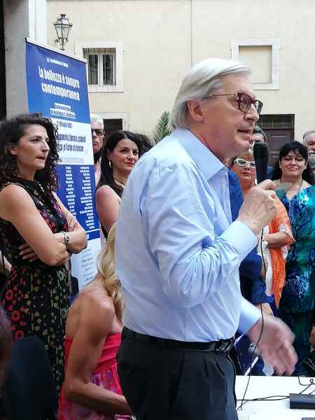 “Viviamo – ha proseguito Sgarbi – in un’epoca davvero nevrotica, sempre sul punto di perdere la bussola: dove quasi qualsiasi parola, addirittura, può fungere da detonatore ad esplosioni di intolleranza, se non violenza vera e propria. Basti pensare, ad esempio, all’incredibile episodio di quell’artista che ultimamente, esponendo in una mostra a Castiglion Fiorentino una sua opera intitolata “Cesso alla turca”, ha rischiato addirittura di causare involontariamente una crisi diplomatica con Istanbul. Ma contro la dittatura del pensiero dominante e del “politicamente corretto” anche nell’arte, è necessario che ognuno di noi reagisca rivendicando, appunto per l’arte, la sua funzione di ricerca del bello, per stimolare quelli che sono i migliori impulsi dell’uomo; e che ognuno di voi, qui (in linea, del resto, con le tesi di grandi movimenti artistici del Novecento come Futurismo ed Espressionismo, N.d.R.), si senta protagonista, cercando appunto il bello nell’arte e mostrando agli altri quello che è, attraverso l’opera di questi artisti presenti, il volto nuovo dell’arte di oggi”.