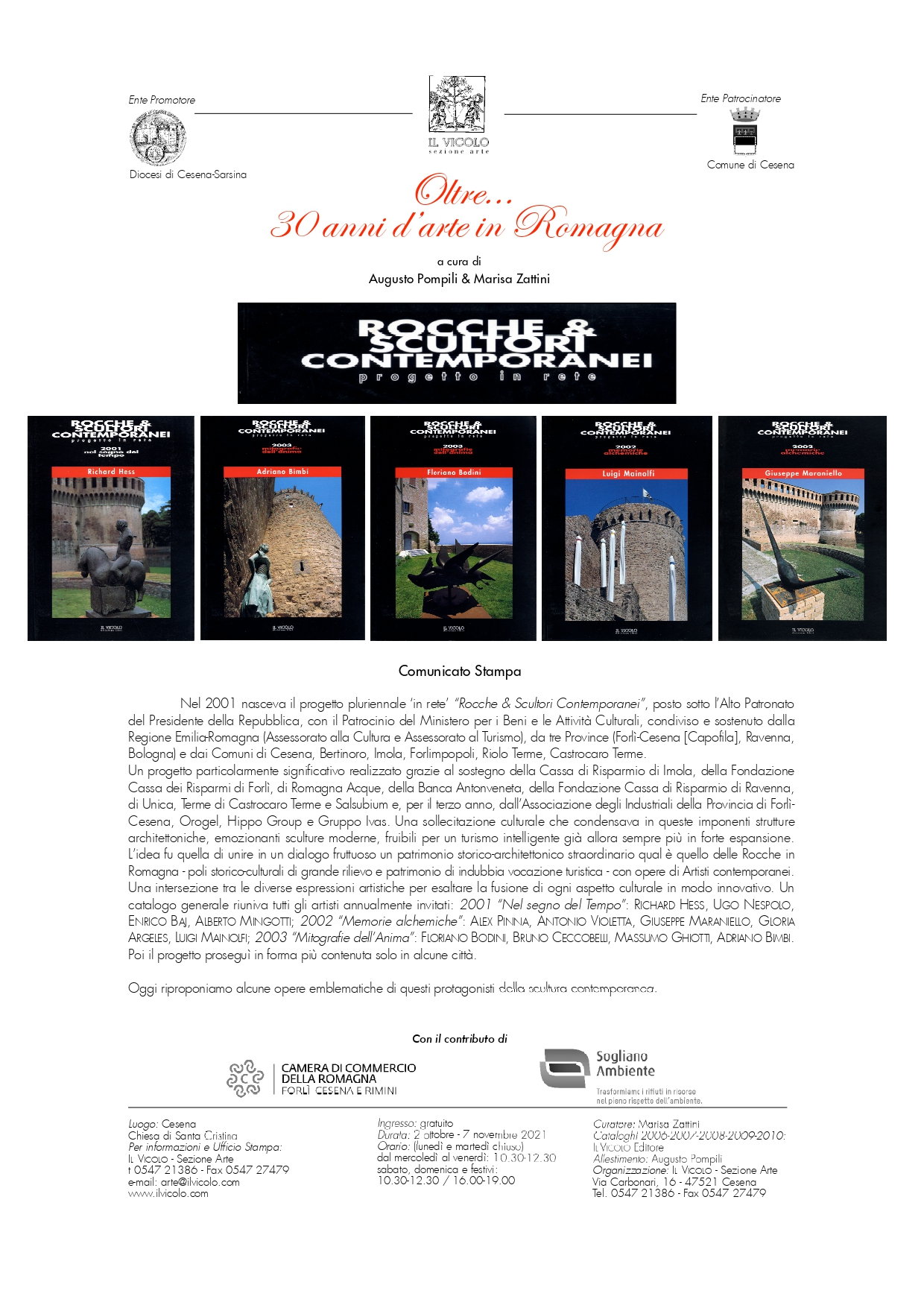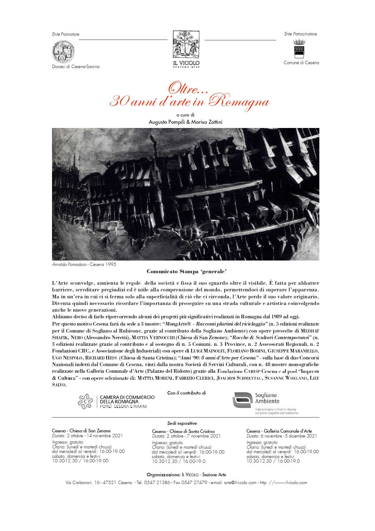 Per questo motivo Cesena farà da sede a 3 mostre: “MongArte® - Racconti plurimi del riciclaggio” (n. 5 edizioni realizzate per il Comune di Sogliano al Rubicone, grazie al contributo della Sogliano Ambiente) con opere prescelte di MEDHAT SHAFIK, NERO (Alessandro Neretti), MATTIA VERNOCCHI (Chiesa di San Zenone); “Rocche & Scultori Contemporanei” (n. 3 edizioni realizzate grazie al contributo e al sostegno di n. 5 Comuni. n. 3 Province, n. 2 Assessorati Regionali, n. 2 Fondazioni CRC, e Associazione degli Industriali) con opere di LUIGI MAINOLFI, FLORIANO BODINI, GIUSEPPE MARANIELLO, UGO NESPOLO, RICHARD HESS (Chiesa di Santa Cristina); “Anni ‘90: 8 anni d’Arte per Cesena” -sulla base di due Concorsi Nazionali indetti dal Comune di Cesena, vinti dalla nostra Società di Servizi Culturali, con n. 48 mostre monografiche realizzate nella Galleria Comunale d’Arte (Palazzo del Ridotto) grazie alla Fondazione CARISP Cesena e al pool “Impresa & Cultura” - con opere selezionate di: MATTIA MORENI, FABRIZIO CLERICI, JOACHIM SCHMETTAU, SUSANNE WHELAND, LILY SALVO.