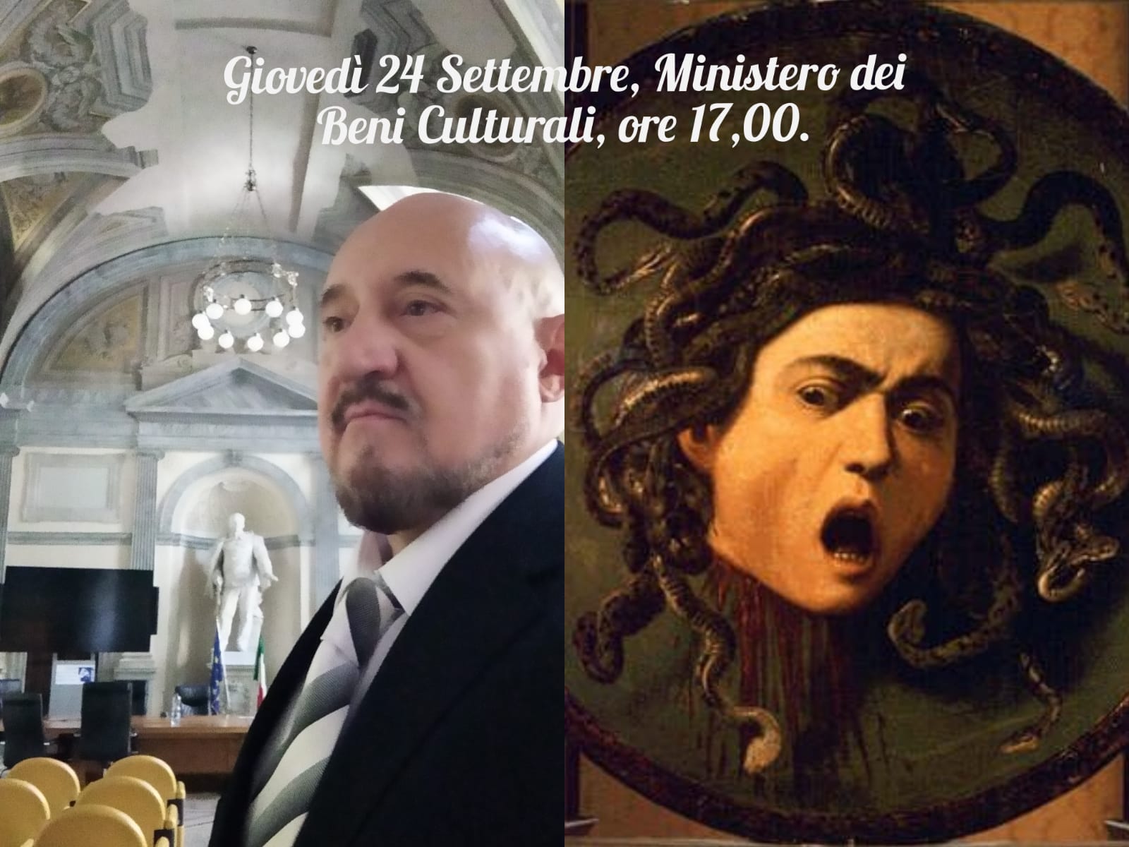 Intervento come relatore del Maestro Giuseppe Tedeschi, pittore, ritrattista e storico dell'arte, Addetto di Anticamera di Sua Santità, alla conferenza "L'eco del mito della Medusa di Caravaggio" tenutasi il 24 Settembre 2020 nella sala "Giovanni Spadolini" del Ministero per i beni e le attività culturali e del turismo.