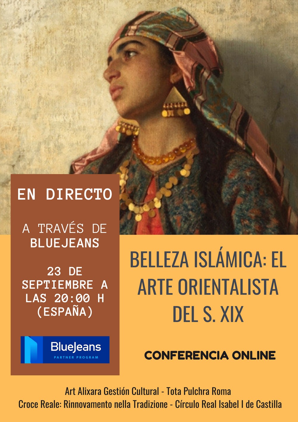 Art Alixara Gestión Cultural, junto con la Delegación de Tota Pulchra en España, la Delegación de Croce Reale en Andalucía y el Círculo Real Isabel I de Castilla, convoca la próxima Conferencia Online titulada “Belleza Islámica: el Arte Orientalista del s. XIX”, que tendrá lugar el próximo miércoles 23 de septiembre a las 20:00 horas (España) desde la plataforma BlueJeans.